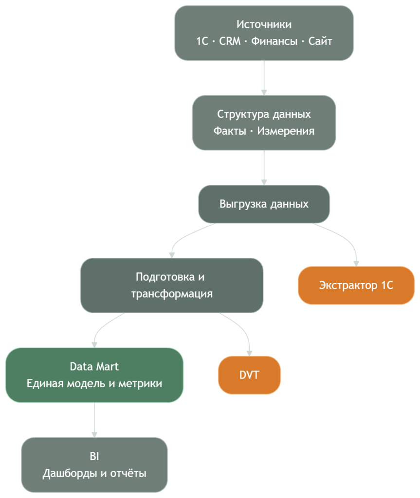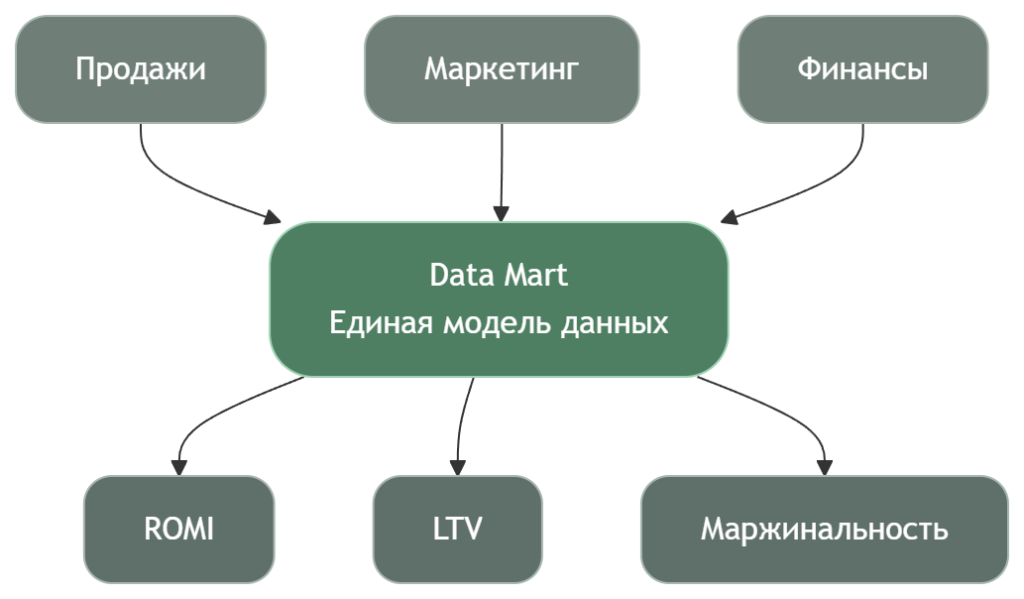 Именно на уровне Data Mart происходит главное: данные из разных предметных областей — продажи, затраты, лиды, платежи — объединяются в одной модели. Это позволяет рассчитывать сквозные метрики (ROMI, LTV, маржинальность продукта), которые невозможно получить внутри одной системы.