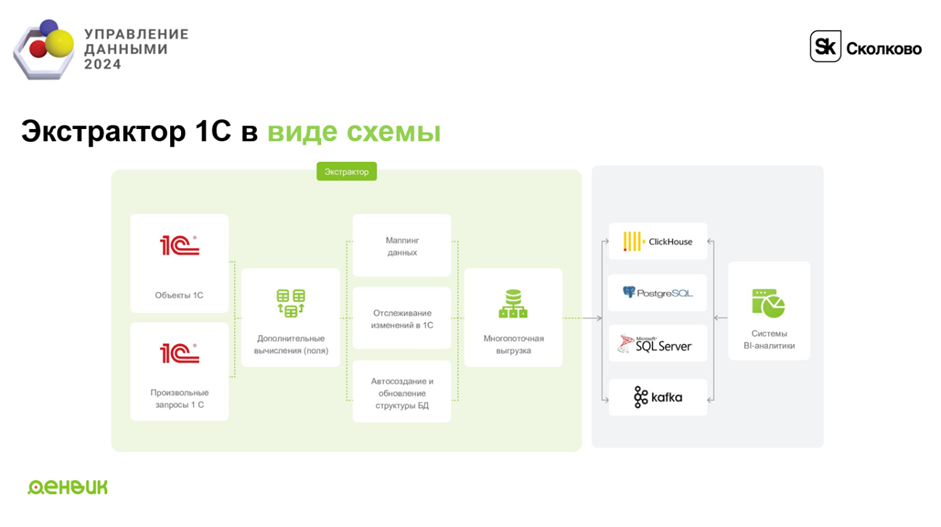- Производительность 1С: Поскольку 1С не отличается высокой скоростью работы, может потребоваться сложная система для распараллеливания выгрузки данных.