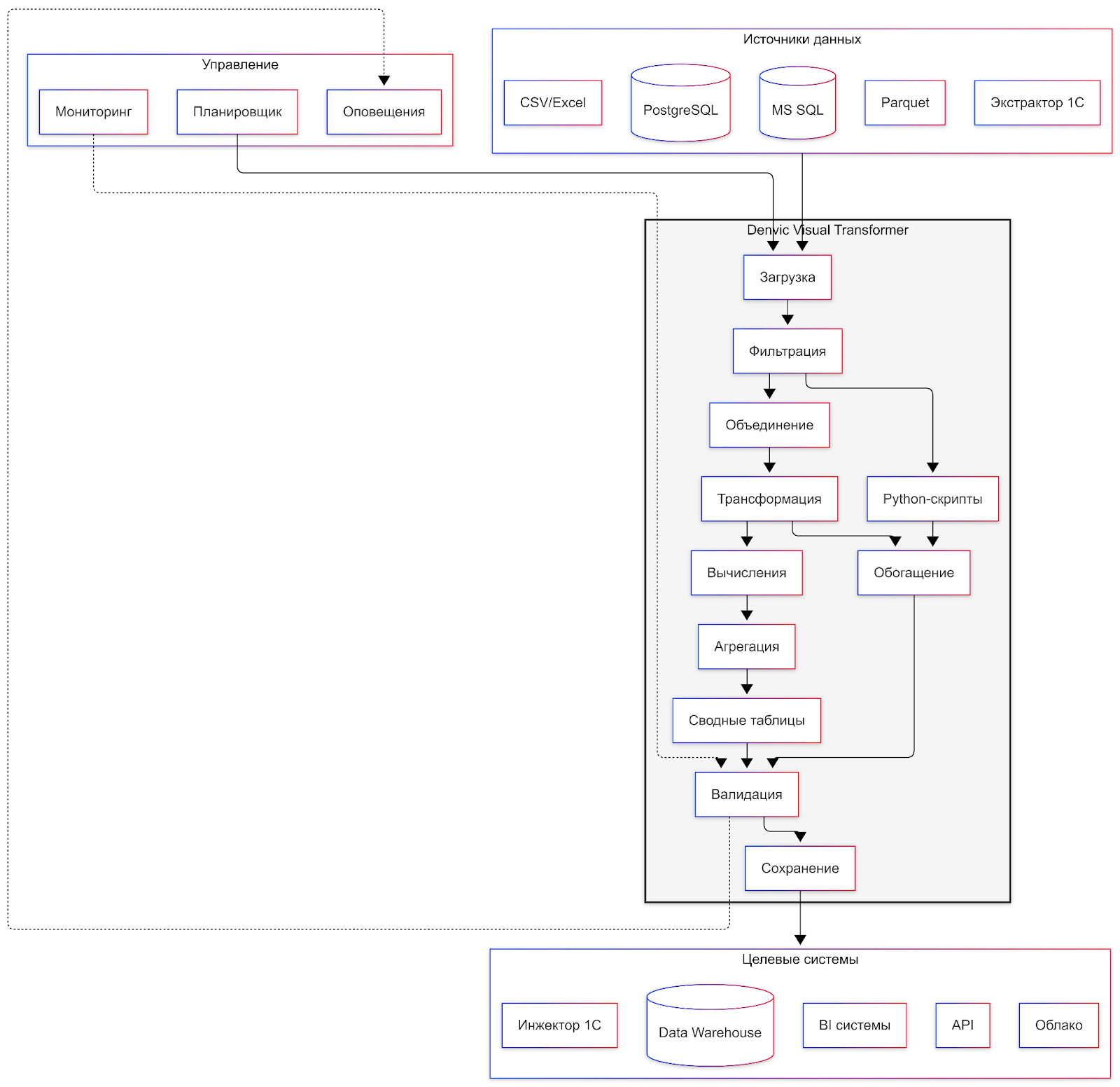 Несколько лет назад мы решили разорвать этот порочный круг. Результатом нашей работы стала полноценная экосистема продуктов Denvic Visual Tools. В её основе — три инструмента: Экстрактор 1C, Инжектор 1C и новый визуальный ETL-конструктор Denvic Visual Transformer (DVT).