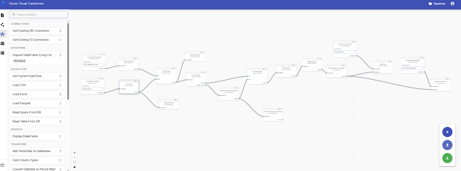 Каждый узел — конкретная операция: фильтрация, группировка, объединение, сортировка, переименование колонок, вычисления и многое другое.
