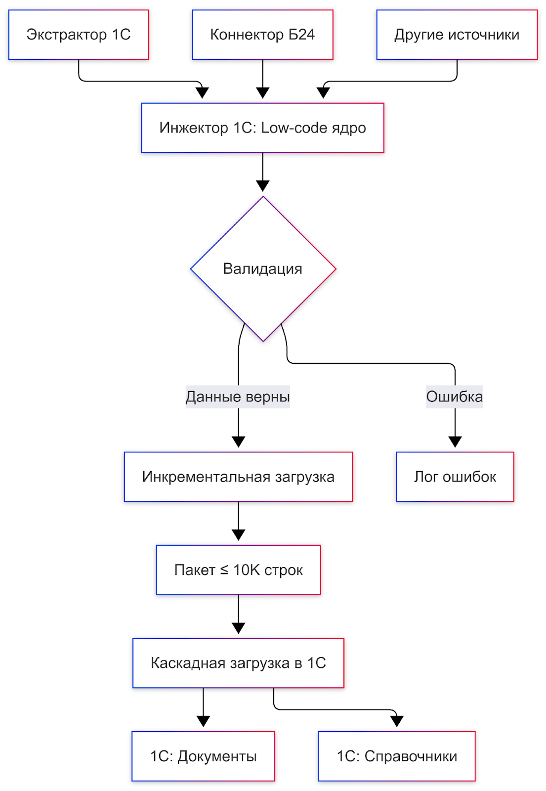 Так появился второй продукт экосистемы — Инжектор 1С, инструмент для надёжной и быстрой загрузки данных в конфигурации 1С, также выполненный в парадигме многопоточности и low-code.