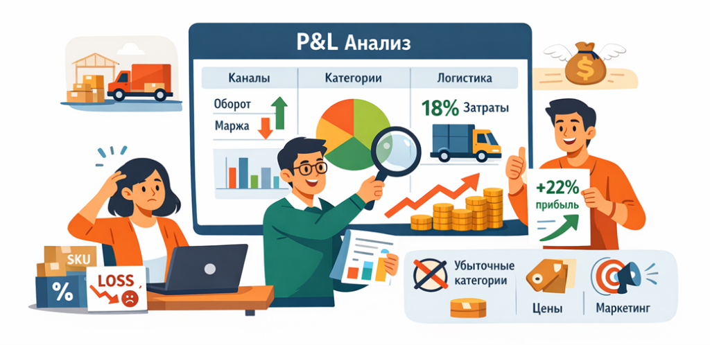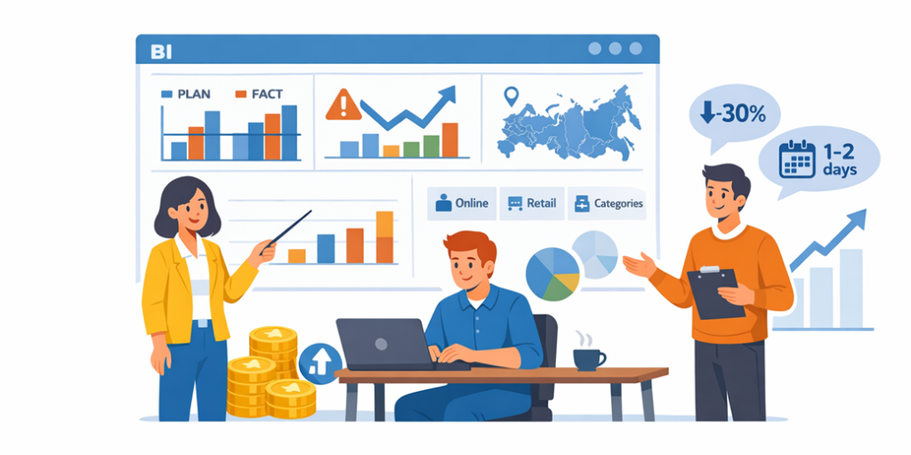 - расчет производных показателей (маржа, себестоимость, CAC и др.)