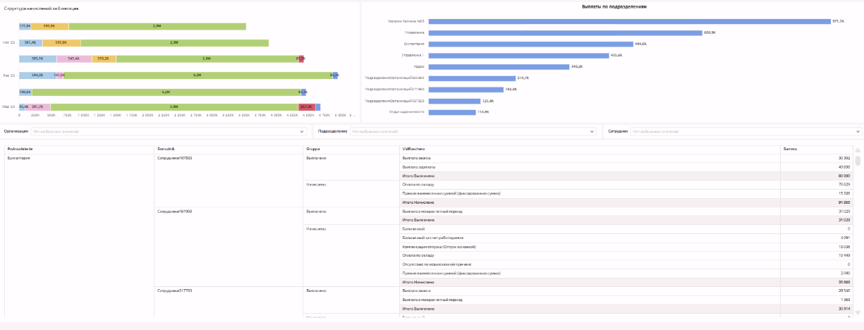 Например, видно, что начислено 36,3 млн, к выплате — 31,5 млн, а премии составили 13 млн. В верхнем блоке собраны ключевые показатели — общие суммы начислений, выплат и премий за выбранный период. Ниже — каскадная детализация: диаграммы показывают, из чего складывается ФОТ, как он распределён по месяцам и подразделениям. Зелёная диаграмма отражает разбивку по статьям начислений (оклады, премии, надбавки), что позволяет быстро увидеть, за счёт чего растёт или проседает фонд. Такая визуальная структура помогает не просто смотреть на сумму, а понимать причины изменений — буквально за несколько секунд.