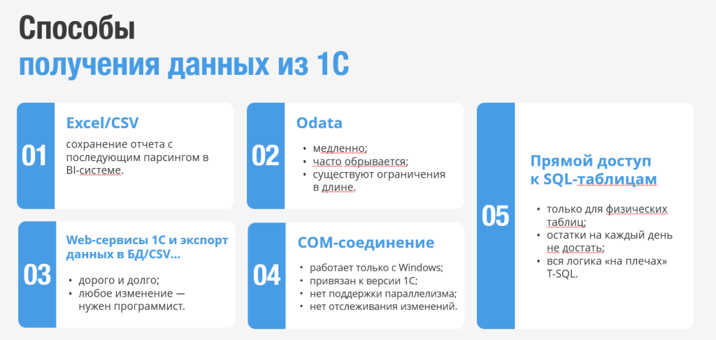 - модель данных, связи между таблицами вам придется собирать "извне" 1С, что часто бывает очень и очень сложно;