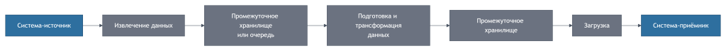 Система-источник → Извлечение данных → Промежуточное хранилище или очередь → Подготовка и трансформация данных → Промежуточное хранилище → Загрузка → Система-приёмник