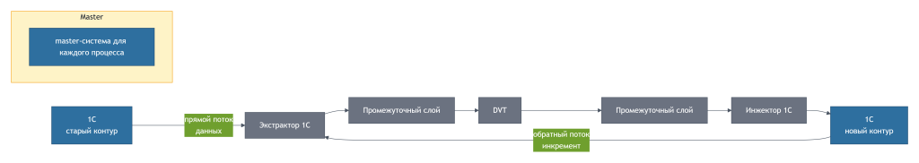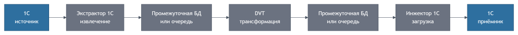 1С (источник) → Экстрактор 1С → промежуточная БД/очередь → DVT → промежуточная БД/очередь → Инжектор 1С