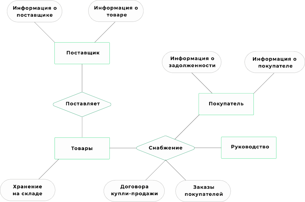 В этой модели мы имеем три объекта: товары, поставщики и склады. Каждый объект имеет свои атрибуты, которые описывают его свойства. Например, товар имеет название, цену и количество на складе.