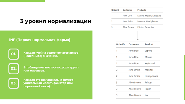 1. Первая нормальная форма (1NF). На этом этапе устраняются повторяющиеся группы. Повторяющиеся группы — это группы атрибутов, которые содержат одни и те же данные в разных местах таблицы.
