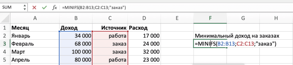 Также удобная функция отметить значение, если оно меньше или больше заданного. Это возможно с помощью функции МИНЕСЛИ.