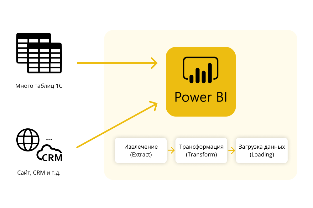 Вся цепочка: ETL «Extract -> Transform -> Loading» часто реализуется внутри Power BI |