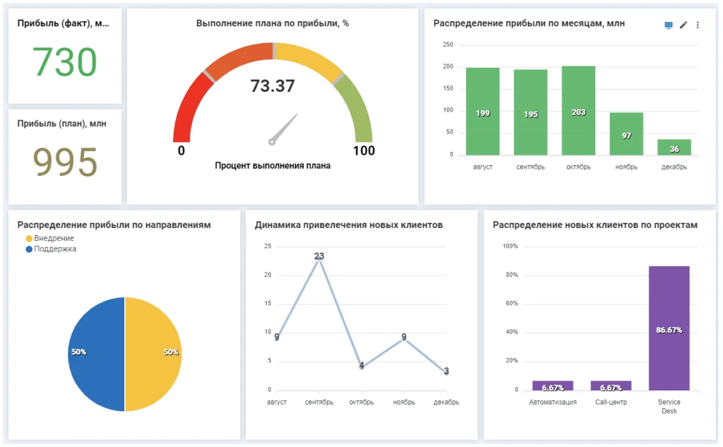 - Стратегические — для управления на уровне всей организации и визуализации KPI высшего уровня. Примером стратегического дашборда может быть обзорная панель для совета директоров крупной корпорации.