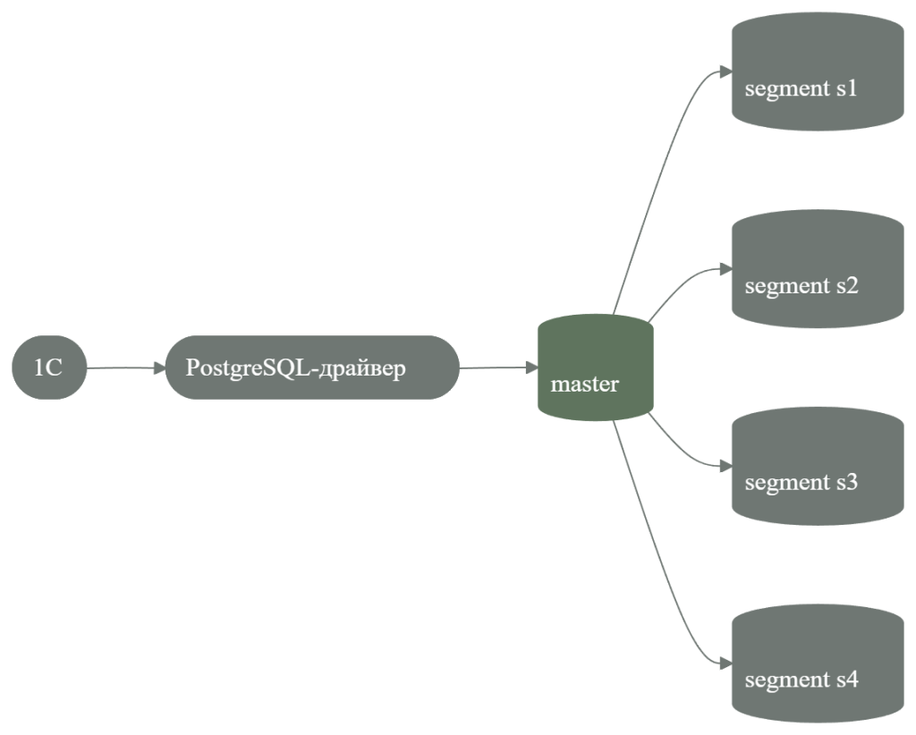 1С → PostgreSQL-драйвер → master → сегменты Greenplum