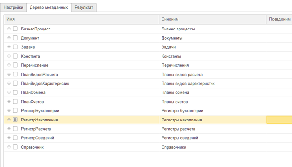 Выберите нужные для выгрузки регистры, документы, справочники, перечисления, константы и другие сущности 1С 8.