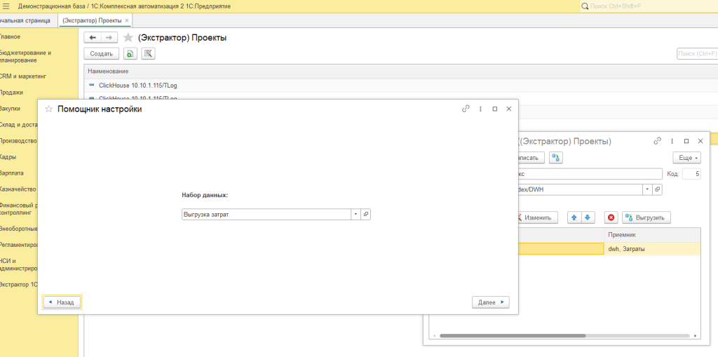 - Данные с помощью экстрактора формируются в пользовательском режиме из 1С на основе объектов метаданных и запросов, в том числе с поддержкой вычисляемых полей, параметров, временных таблиц