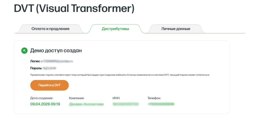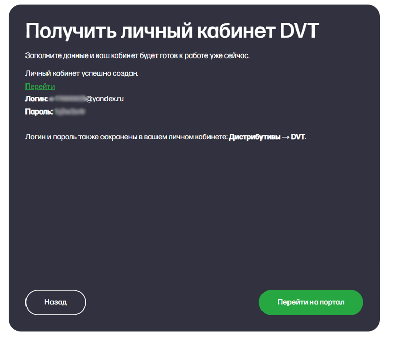 данные учетной записи и кабинета DVT, а также ссылка для перехода в личный кабинет