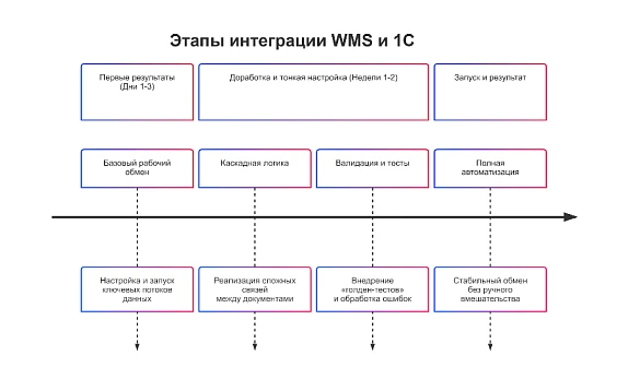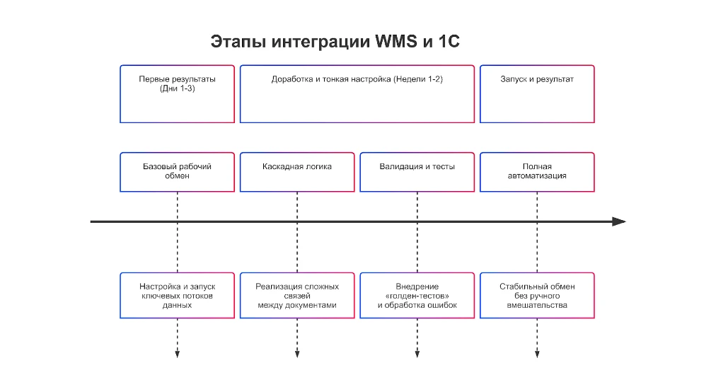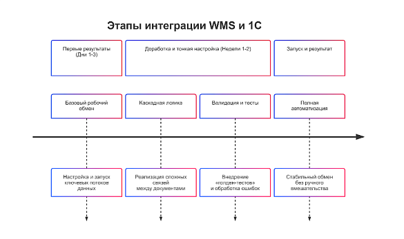 Главная задача клиента была очевидной: восстановить двусторонний обмен между WMS и 1С в максимально короткие сроки — и сделать его стабильным, предсказуемым и не зависящим от ручных сценариев.